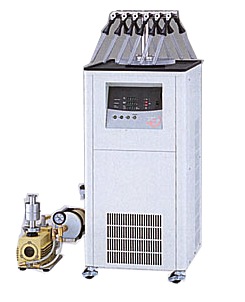 水溶液を凍結させたのち、低温で減圧に吸引することで、水溶媒を除去する機器です。タンパク質などの生体高分子の濃縮や粉末化 (パウダー化) に用いる、いわゆる、フリーズドライ装置です。